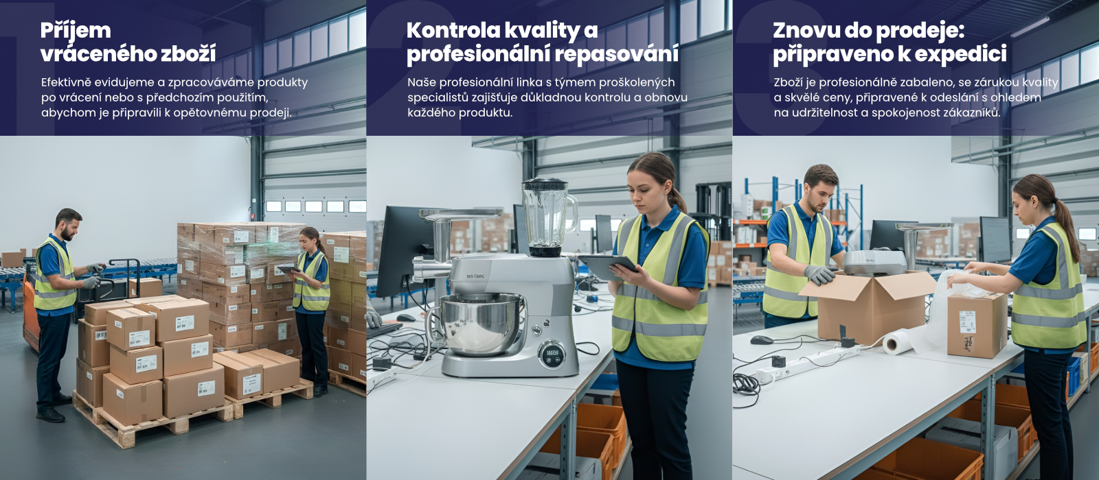 Jsme specialisti na vrácené zboží a nadbytky zásob. Od dob našeho založení rosteme každoročně o desítky procent, díky naší profesionalitě a důvěryhodnosti si nás vybrali za partnery největší světové značky, řetězce a eshopy. Transparentnost a důvěra jsou základem naší spolupráce s každým našim partnerem. Naši partneři přesně vědí, co se s jejich zbožím děje, v jakém je stavu a kde se prodává. Hlavní sídlo naší společnosti je v Baťovském Zlíně, kde máme své kanceláře, servis, repasovací linku a sklady.